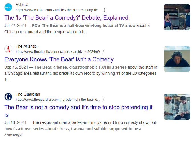 I'm thinking here of Anna Kornbluh's 2024 monograph Immediacy, or The Style of Too Late Capitalism, which has clearly proven to be an animating text at the intersection of contemporary literary and media studies. Citing, for instance, the formal breakdown of the distinctions between televised half-hour comedies and hour-long dramas that has given rise to the (often critically acclaimed) "dramedy" (see below), Kornbluh diagnoses everything from autofiction to endless algorithmic feeds (which have only gotten worse) as symptomatic of an exploitative interest on the part of corporations and governments in isolating individuals from collective thinking and genuine solidarity.