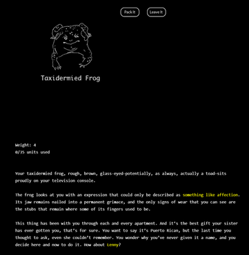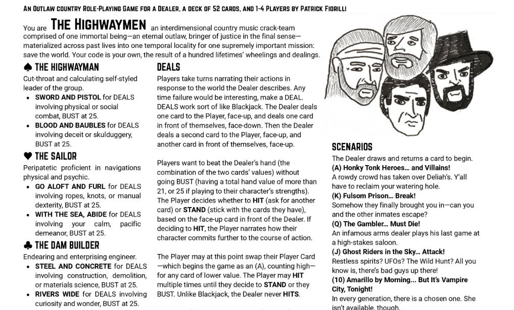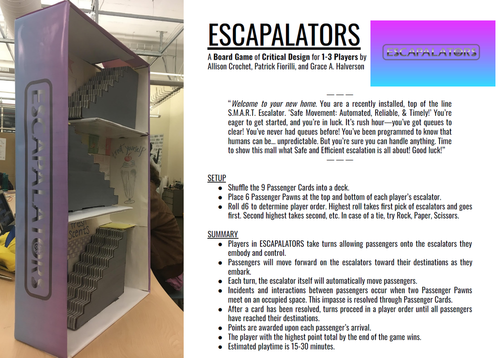 (2025) The Highwaymen—An outlaw country role-playing game for a dealer, a deck of 52 cards, and 1-4 Players. (Click here to play!)(2019) Jamais Vu—An essay game about the founding myth of cinema. (Click here to play!)(2019) The Hand Speaks—A demonological audio inquiry into new materialist embodiment.(2019) Mayor Dog—A cute and co-operative narrative card game about a dog’s administration. In collaboration with Alexus Clark, Zhiyu Lin, Maddie McRoy, and Claire Stricklin.(2019) Smash the State—An off-beat digital variation on solitaire about demolishing face cards. In collaboration with John Britti and Josh Terry.(2018) Life Pack—An interactive Twine narrative about holding onto and letting go. In collaboration with Jihan Sherman and Takeria Blunt. (Click here to play!)(2018) Telling the Bees—An interactive exhibit about remediating ritual. In collaboration with Jihan Sherman and Takeria Blunt. (Click here to learn more!)(2018) Escapalators—A critical design board game about space, movement, and escalators. In collaboration with Allison Crochet and Grace A. Halverson.